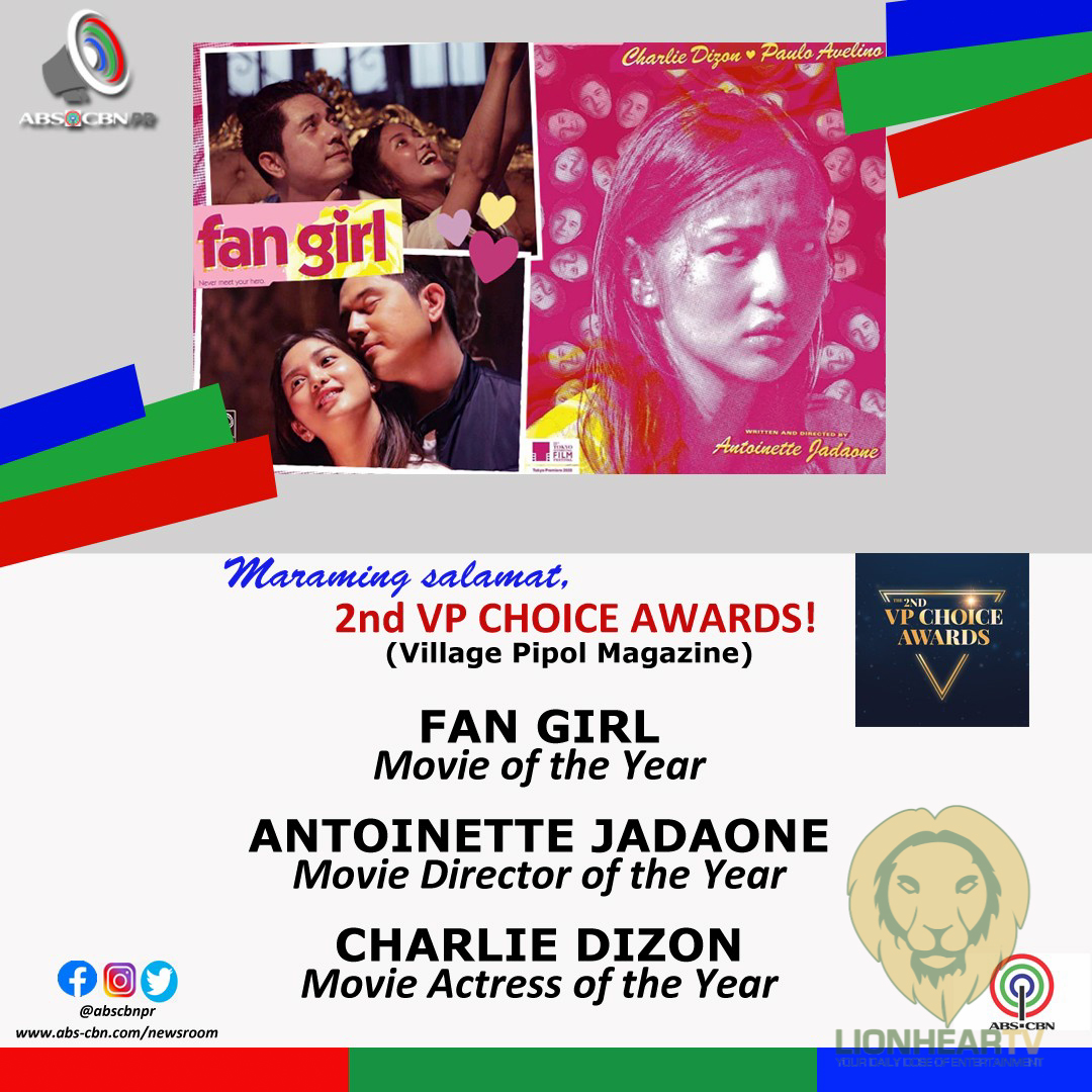 “Fan Girl,” a collaboration between ABS-CBN Films’ Black Sheep, Globe Studios, Project 8, Epicmedia, and Crossword Productions, was also recognized as VP Choice Awards’ Movie of The Year, while director Antoinette Jadaone won Movie Director of the Year.