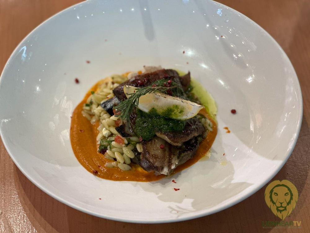 For the main course, Chef Kalel serves a generous portion of Grilled Lamb Ribs resting on a bed of homemade harissa sauce. Served alongside is a cold orzo salad enriched with Doña Elena Black Olives. The harissa sauce, a Mediterranean condiment, is made from scratch and notably features Doña Elena Pure Olive Oil, combined with fiery spices such as chilies, cumin, and coriander, complemented by a lightly sweet red capsicum. The cold orzo salad, drizzled with Extra Virgin Olive Oil (EVOO), is finished with a citrusy gremolata, crafted from finely chopped parsley, garlic, and lemon, offering a refreshing contrast to the smoky and tender lamb.