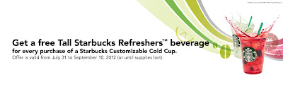 Receive a complimentary Tall Starbucks® Refreshers™ Beverage for every purchase of 16 oz. Customizable Cold Cup Tumblers (with flat lid and dome lid) from July 31 to September 10, 2012.