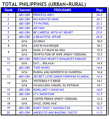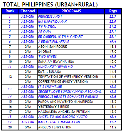 “Princess and I” (34.2%-Thurs.; 32.7%-Fri.) and “Ina Kapatid Anak” ( 34.1%-Thurs.;32%-Fri.) in virtual tie for weekday leadership followed by “TV Patrol” (33.3%; 31.2%), “Aryana” (27.8%/27.1%) and “A Beautiful Affair” (20.8%/19.4%). “Be Careful with my Heart” (23.9%/19.4%) remains the unperturbed weekday morning ratings leader