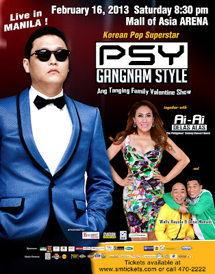 Sharing the stage with the country’s comedy concert queen AiAi delas Alas with special guests: comedy duo Jose and Wally, the show titled PSY Live in Manila! will be on February 16, 2013 8:00 pm at SM Mall of Asia Arena. This show is presented by That’s Ntertainment Production, Ovation Productions and Music Management International.