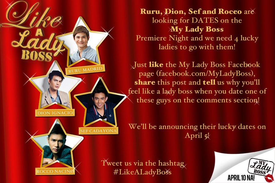 Kapuso heartthrobs Rocco Nacino, Dion Ignacio, Sef Cadayona and Ruru Madrid, who are part of the upcoming romance-comedy movie “My Lady Boss,” are dangling an unusual invitation: they are looking for ladies who could be their date during the red carpet premiere of the movie happening on April 9 at SM Megamall.
