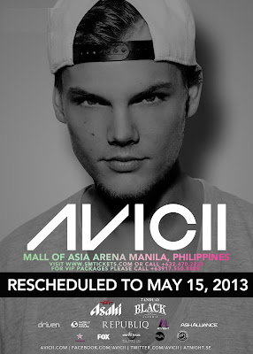 MCA Music and Republiq, World Wide Womb and Driven Manila presents… Avicii Live in Manila, May 15, 2013 – 9:00pm, Mall of Asia Arena, Pasay City. TICKETS ARE AVAILABLE AT SM Tickets outlets. Call 470-2222 or visit www.smtickets.com to buy tickets online