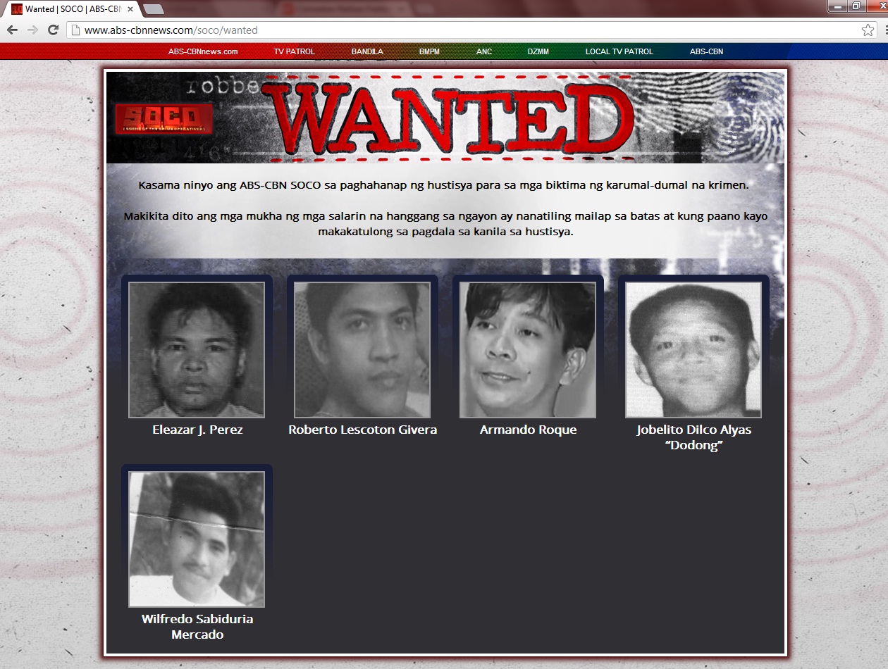 To strengthen its campaign, “SOCO” has also launched a microsite (www.abs-cbnnews.com/soco/wanted) where details about the offenders featured in the show are posted, as well as instructions on how to help law enforcers catch them.