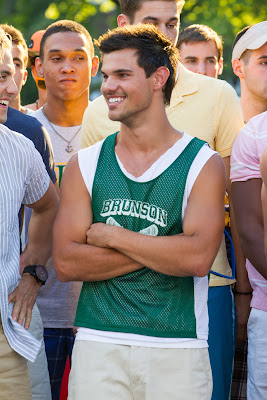 In one of the funniest scenes from the film, Lautner’s frat boy Andy shows Lenny (Sandler) and his childhood chums who’s boss when they return to their old swimming hole. Lenny calls Andy and his visor-sporting, khaki shorts-wearing bros out for looking rather “Abercrombie.” But the younger set gets the next laugh at the expense of those returning “Grown Ups” played by Kevin James, Chris Rock, and David Spade as they are forced by the frat pack to cliff dive in the buff.
