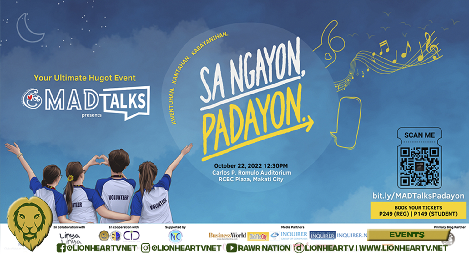 MAD Talks presents: Sa Ngayon, Padayon. is happening on Saturday, October 22, 2022, 12:30PM at the Carlos P. Romulo Auditorium of RCBC Plaza in Makati City. Get ready to be inspired with stories of struggles and survival (Kwentuhan), be entertained with soulful songs (Kantahan), and believe in the ‘MADgic’ of volunteerism (Kabayanihan). Reserve your seats at bit.ly/MADTalksPadayon. Ticket price is PHP 249.00 inclusive of a bottle of coffee, tote bag, and donation to I am M.A.D. programs. Student rate is available at PHP 149.00.