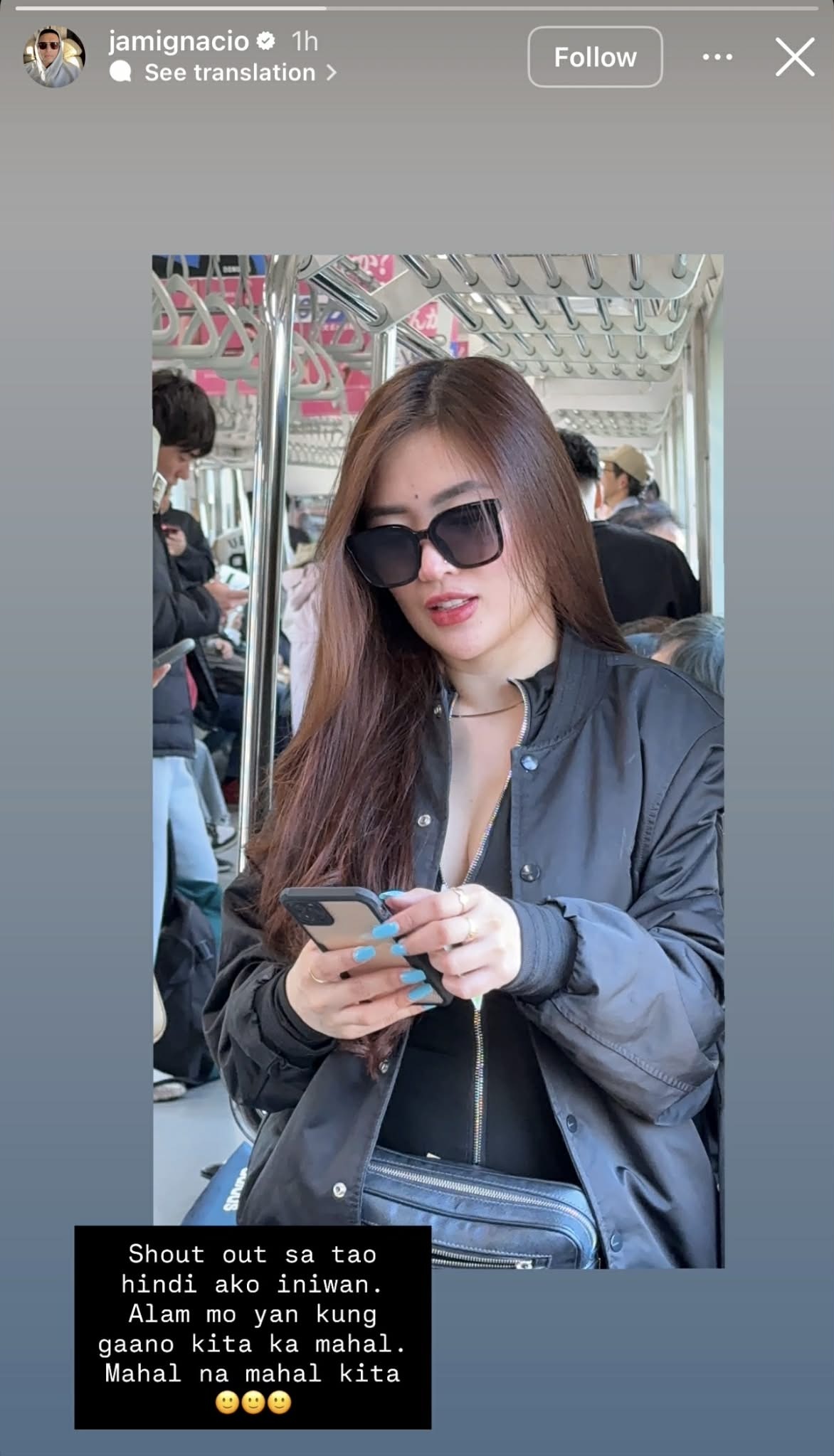 In an Instagram Story posted early Monday, Ignacio shared a photo of Aw inside what appeared to be a train, accompanied by the message: “Shout out sa tao hindi ako iniwan. Alam mo yan kung gaano kita ka mahal. Mahal na mahal kita”, followed by three smiling emojis. Aw is currently in Japan, based on her recent Instagram Stories.