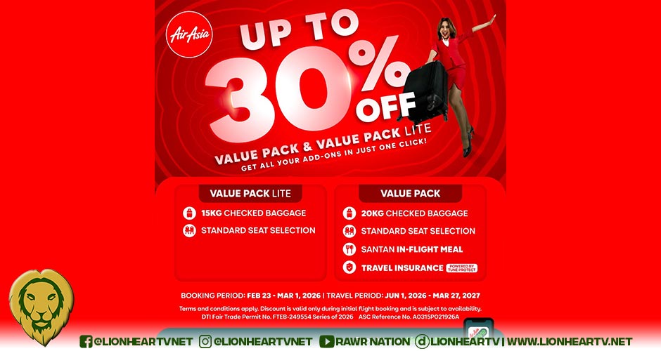 As an added benefit, guests booking through AirAsia MOVE can enjoy an additional 30% off on Value Pack add-ons. For passengers who have already booked and wish to include 20 kg of baggage, rates start at ₱616 for domestic flights and ₱1,089 for international flights. This special offer is available until February 28, 2026.