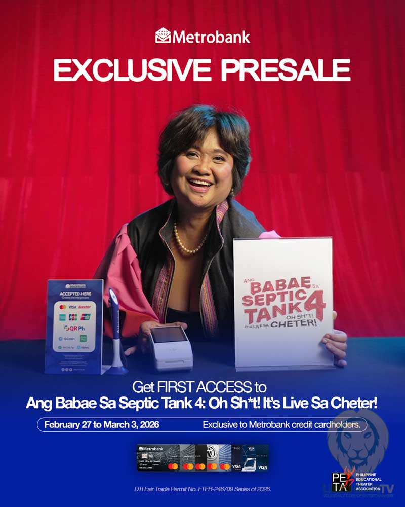 Ticket selling officially begins on February 27 for the Philippine Educational Theater Association’s (PETA) biggest theatrical event of 2026, Ang Babae Sa Septic Tank 4: Oh Sh*t! It’s Live Sa Cheter! —with Metrobank credit cardholders enjoying exclusive first access to the highly anticipated production.