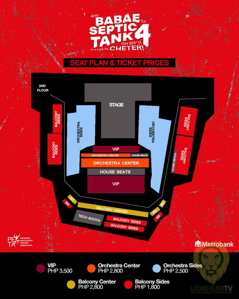 Ticket prices are P3,500 (VIP), P2,800 (Orchestra and Balcony Center), P2,500 (Orchestra Side), and P1,800 (Balcony Side).