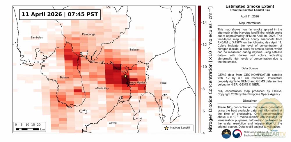 On the morning of 11 April 2026, high nitrogen dioxide was observed over Navotas City, withelevated levels extending as far as Bataan due to predominantly westward wind from Navotas.By the afternoon of 11 April, NO₂ concentrations had decreased but remained relatively highacross Metro Manila.Observations are consistent with reports and measurements on the ground that the air qualityimpacts of the landfill fire extended beyond the immediate vicinity.