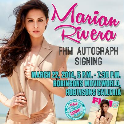 Have you gotten yourself a copy of FHM Magazine March 2014 ish? Well, have it signed by none other than the Primetime Queen on Marian’s newest FHM Magazine cover autograph signing on March 22, 5:00pm at Robinsons Movieworld, Robinsons Galleria! We’ve heard that they sell like pancakes so you better get yourself one now! See you there!
